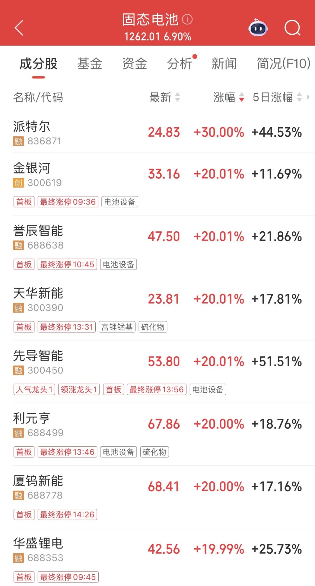 题材方面,固态电池概念股集体爆发,派特尔30%涨停,金银河、誉辰智能20%涨停,此外还有超20只个股涨停。